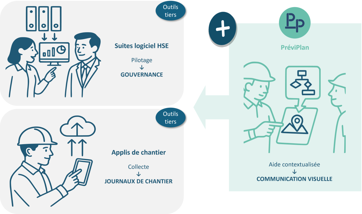Spécialisé plutôt que généraliste, PréviPlan apporte le niveau de profondeur métier qui manque aux plateformes et complète vos suites HSE ainsi que vos applis de chantier — sans les remplacer.